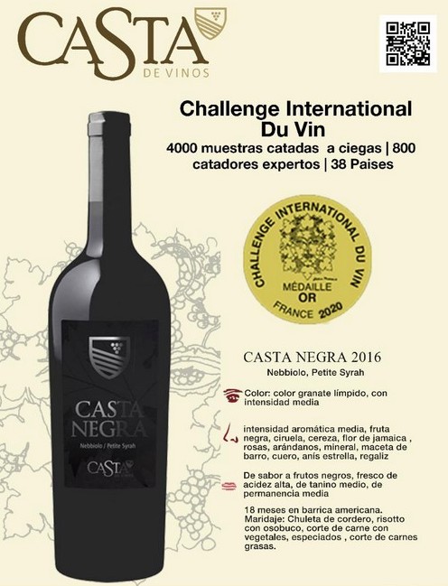 Por su parte, la Bodega Casta de Vinos obtuvo Medalla de Oro con su fantástico Casta Negra 2016. Elaborado con 85% Nebbiolo y 15% Petit Syrah, con paso de 18 meses en barrica y 24 meses en botella.