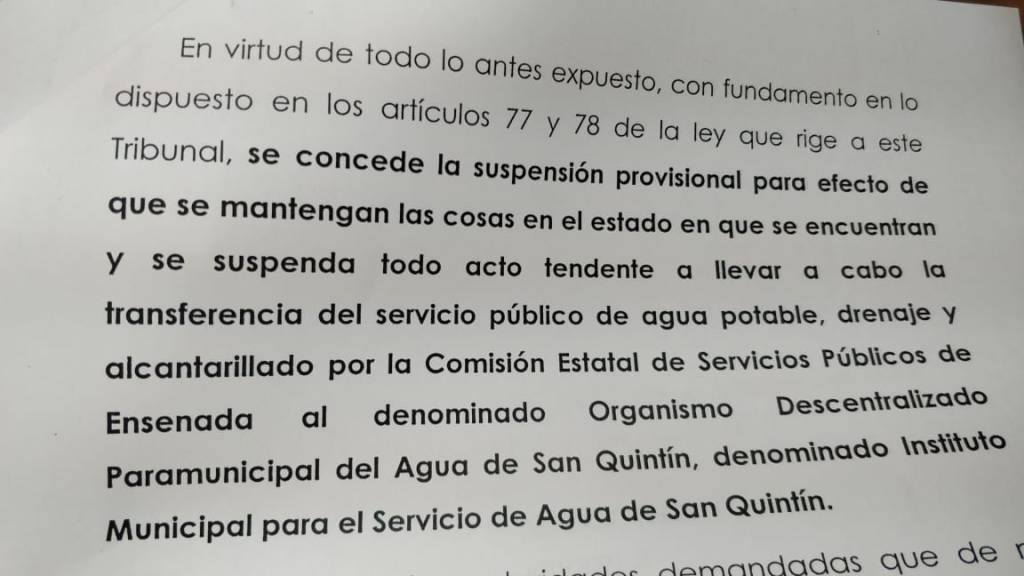 Adicional a eso, ocho ciudadanos demandaron la nulidad de la entrega del servicio de agua el Concejo Municipal de San Quintín, puesto que éste omitió realizar un análisis presupuestal y financiero para prestar el servicio de agua potable y alcantarillado, por lo que se encuentra en riesgo su adecuado funcionamiento, por lo tanto el Tribunal Estatal de Justicia Administrativa frenó la entrega de la CESPE al Instituto Municipal para el Servicio de Agua de San Quintín.