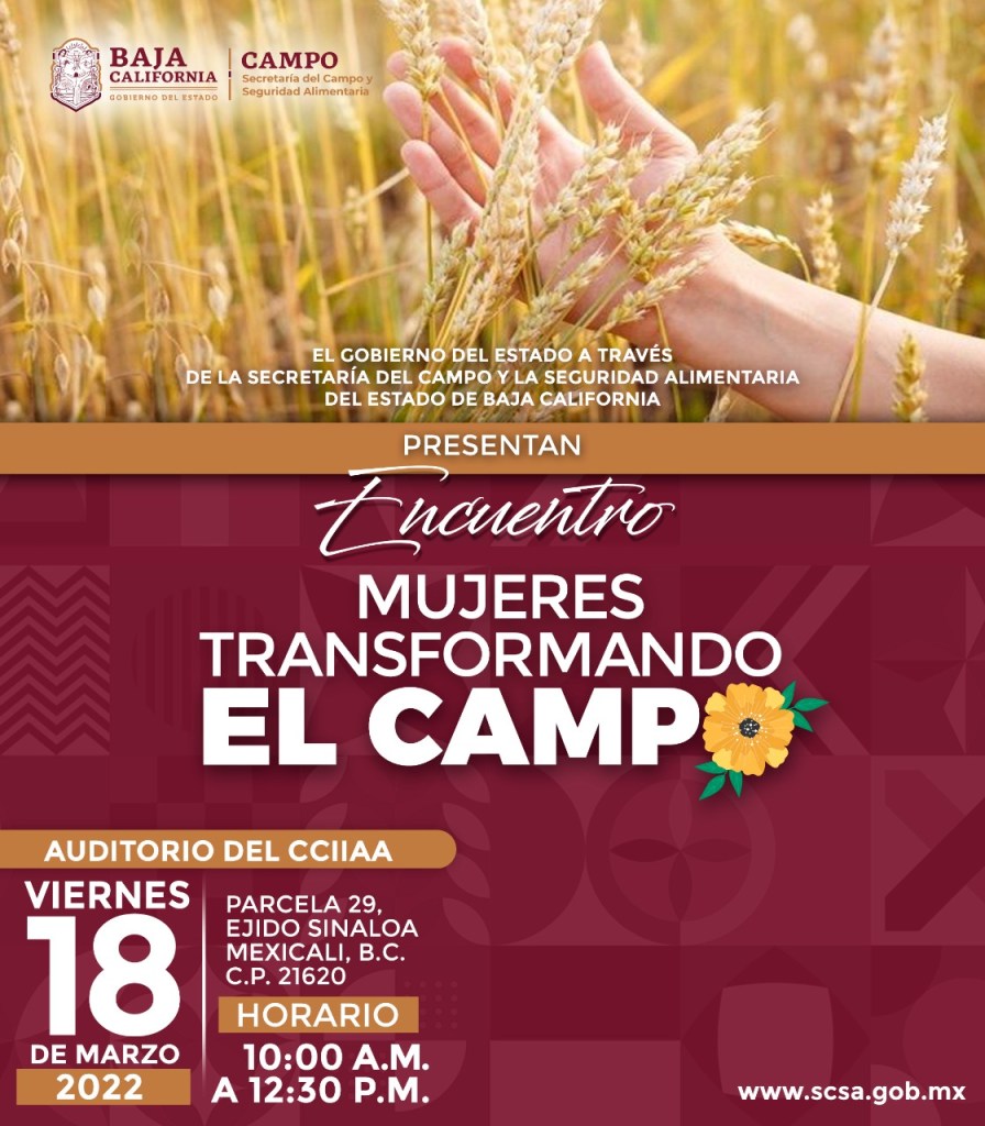 Mexicali, B.C.- En el marco de la conmemoración del 8 de marzo, Día Internacional de la Mujer, la Secretaría del Campo y la Seguridad Alimentaria de Baja California (SCSA), invita al “Encuentro: Mujeres Transformando el Campo”.