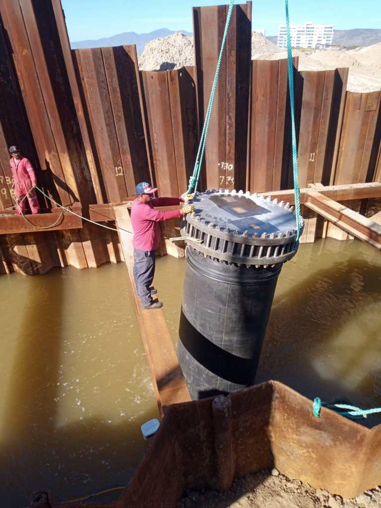 De igual forma se hizo el fondeo en la tubería de 72 metros y 54 pulgadas a 8 metros por debajo del mar, así como la instalación de la conexión con la abrazadera mecánica y hermética y el ensamblaje de abrazadera.